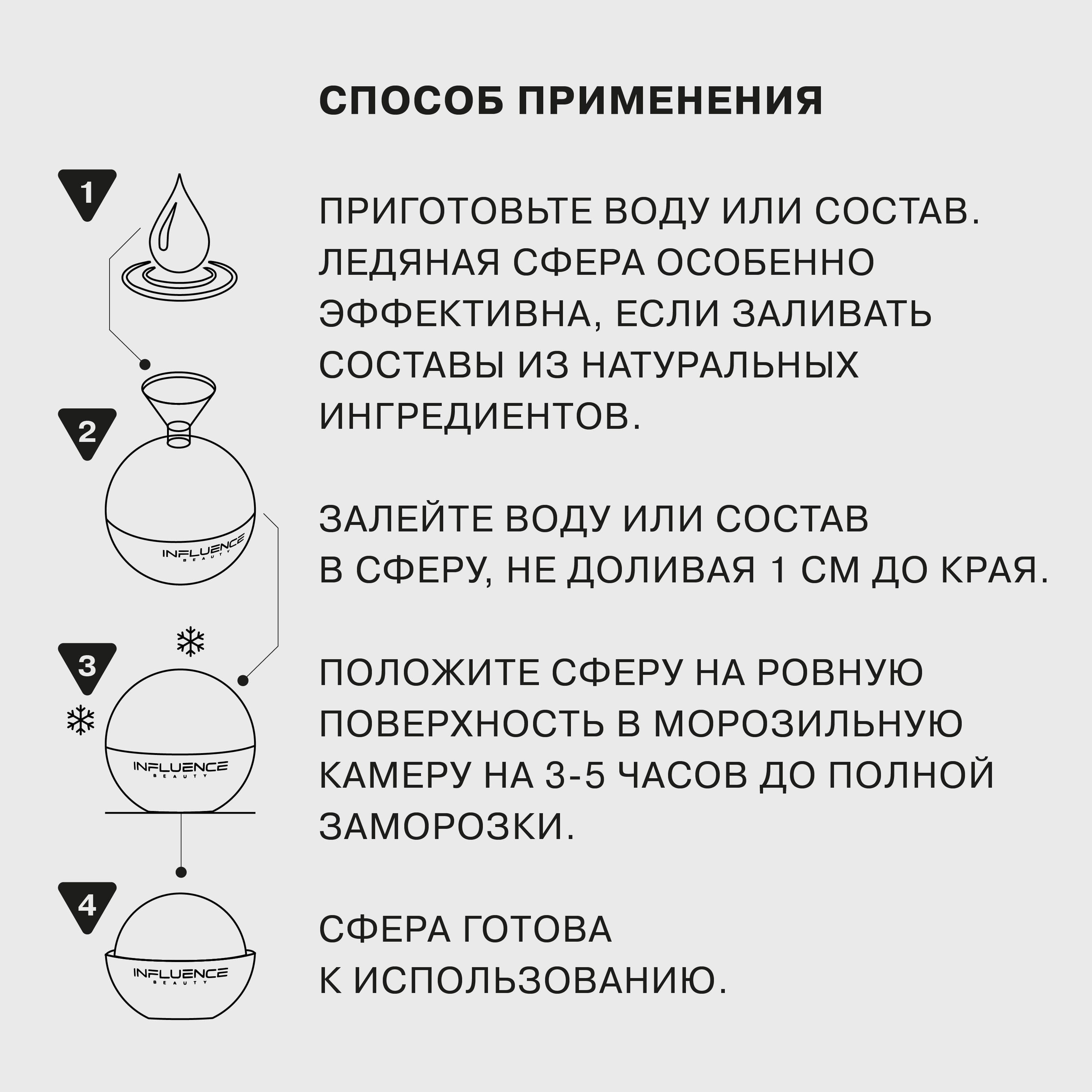 Способ нанесения: Приготовьте воду или другой состав для заморозки. Для большей эффективности рекомендуется использовать специальные рецепты для приготовления состава. Рецепт состава нужно подбирать, ориентируясь на свой тип кожи. Залейте воду или состав в сферу при помощи воронки, которая входит в комплект. Рекомендуем не доливать 1 см до конца сферы. Положите сферу на ровную поверхность в морозильную камеру. Оставьте на 3-5 часов до полной заморозки состава. Процедура ухода ледяной сферы должна занимать не больше минуты. Не допускайте задерживания ледяной сферы на одном и том же участке лица во избежание его переохлаждения. Протирайте очищенную кожу лица скользящими движениями по массажным линиям.
