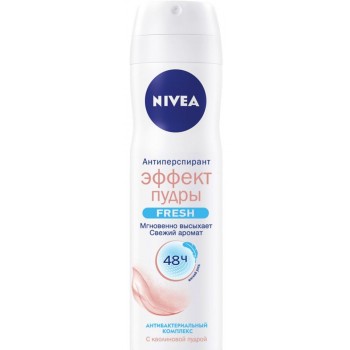 "Эффект пудры. Fresh" - это мощный антиперспирантный спрей, который обеспечивает эффективную защиту от пота в течение 48 часов! Ваша кожа подмышек остается сухой и мягкой на ощупь! Нежный запах цветов с оттенком янтаря будет с вами в течение всего дня. Антиперспирант Nivea "Эффект пудры. Fresh" содержит порошок каолина, который быстро высыхает и оставляет подмышки неотразимо мягким. Антиперспирант Nivea обладает превосходными абсорбционными свойствами и обеспечивает защиту от запаха тела. Получите нежную подмышку и наслаждайтесь ощущением свежести до 48 часов с уникальным антиперспирантом Nivea! Антиперспирантное порошковое прикосновение без спирта и красителей обеспечивает оптимальное сочетание эффективной защиты от пота и нежного ухода в одно и то же время. Встряхните перед использованием! Наносить на расстоянии 15 см прямо на кожу подмышки.