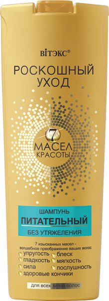 Мягко и бережно очищает, питает и восстанавливает волосы по всей длине, предотвращая появление секущихся кончиков, уменьшает ломкость волос. Придает им невероятный ослепительный блеск, зеркальную гладкость, мягкость и шелковистость. В комплексе с бальзамом линии "7 масел красоты" шампунь оказывает эффективное воздействие на волосы, придавая им по-настоящему роскошный вид.